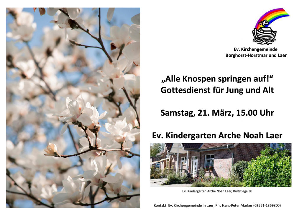Die Evangelische Kirchengemeinde in Laer lädt herzlich ein zu einem Frühlings-Gottesdienst für Jung und Alt am 21. März um 15.00 Uhr im Ev. Kindergarten Arche Noah Laer, Bültstiege 30. Pfarrer Hans-Peter Marker freut sich auf einen lebendigen Gottesdienst: „Unter dem Motto „Alle Knospen springen auf!“ singen wir fröhliche Lieder zum Mitmachen, in einer Geschichte für Kinder und Erwachsene geht es um Gott, der neues Leben schafft. Im Anschluss sind dann alle eingeladen zu einer leckeren Frühlings-Kinderbowle und Keksen.“ Vielleicht haben Sie ja Zeit und Lust, am Samstag in den Ev. Kindergarten Arche Noah zu kommen – allein, zu zweit, mit Kindern oder Enkelkindern, wir würden uns freuen! Sie können diesen Hinweis gern auch an andere Interessierte weiterleiten.